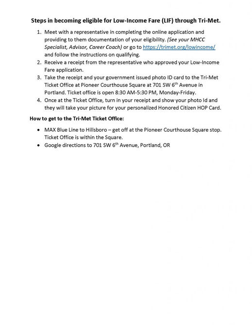 To request for a TriMet pass, please contact Claudia at Claudia.Reinozo@mhcc.edu or Riley at Riley.Lakos@mhcc.edu, or call 503-491-7447. For further information, please contact Rich at Rich.Duval@mhcc.edu.